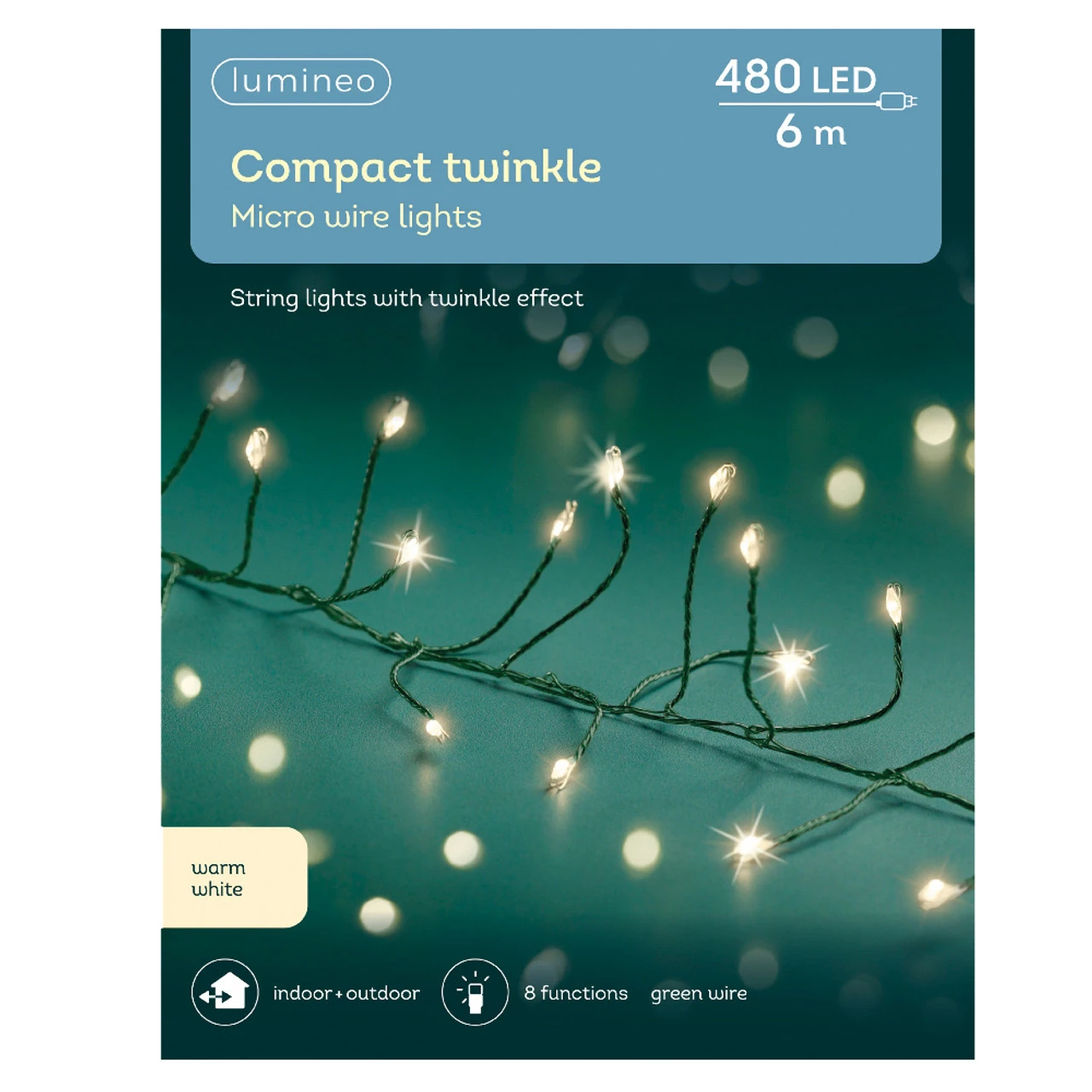 - 480 warm white LED lights on a green cable emit a warm and inviting glow.